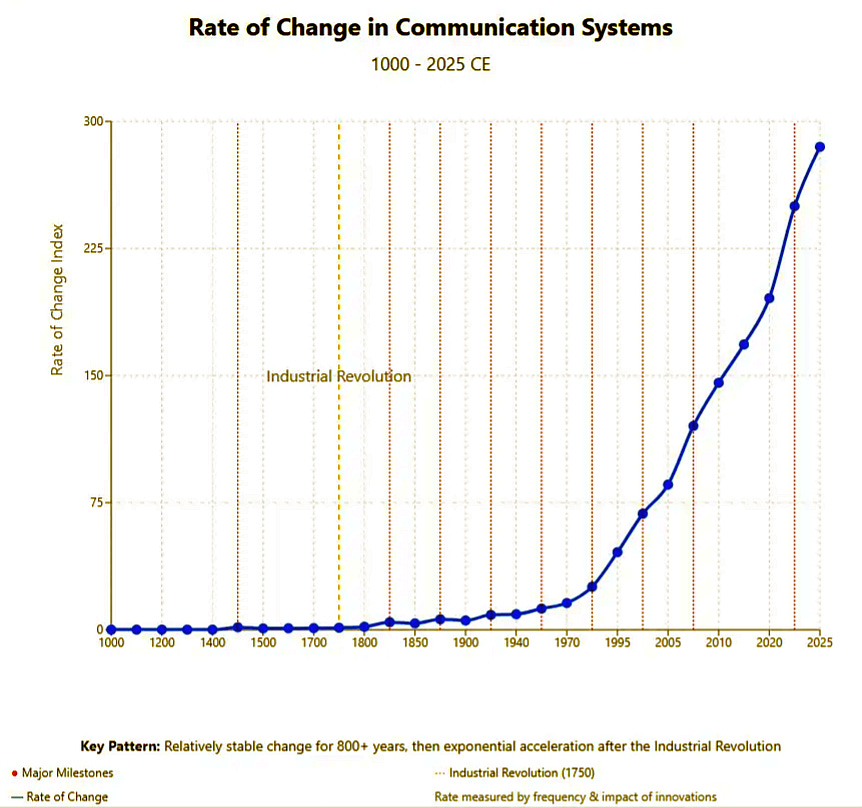 Since the Industrial Revolution, humans have been living in an ecosystem of accelerating change. Each new disruption—from industrialization to the internet to AI—arrives faster than we can fully adapt. Like that oil spreading across the pond's surface, these rapid changes can suffocate established systems of communication and shared understanding.